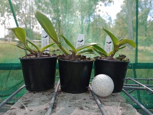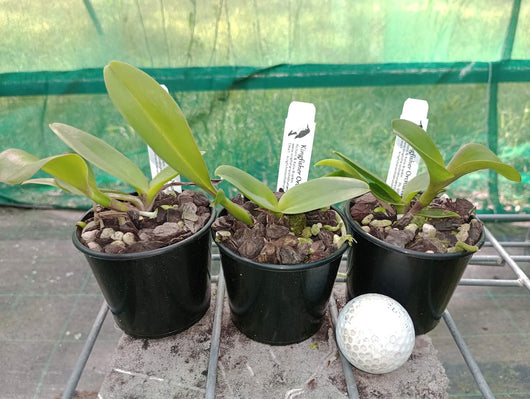 Mericlones of Rlc. Thaksina Gold '#2', established in 80mm pots. A nice, bright yellow exhibition Cattleya. Big, bright flowers.